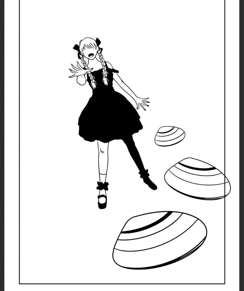 효과선과 배경을 더해서 컷을 완성했다. 마법진 효과와 드레스 모두 검은색이라 배경과의 구분을 위해 잠시 색깔을 더하고 투명도를 낮춘 모습이다. 원고 펜터치를 마친 이후에는 채색을 잘 해야 검은색끼리도 구분이 쉬울 것이다.