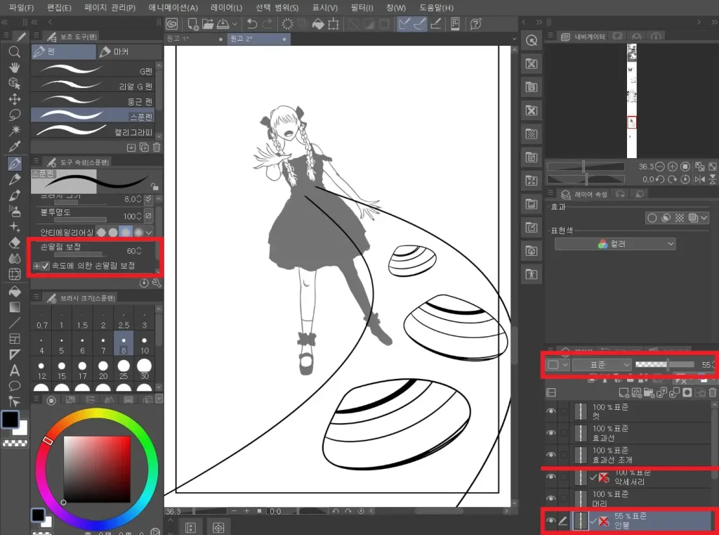 작업은 위처럼 진행할 수 있는데 그림 스타일에 따라 적당히 조율할 수 있다. 펜의 손떨림 보정 숫자를 높이면(최대 100) 펜 움직임이 느려지면서 곡선 그리기에 최적화된다. 선을 완성했다면 다시 보정치를 풀어주자.