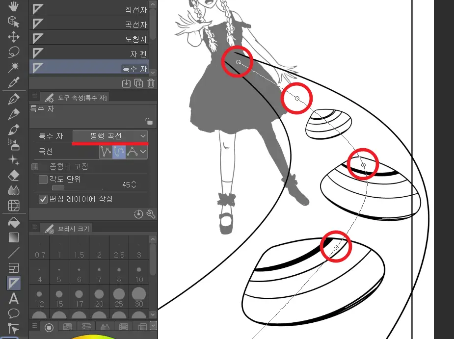 이제 곡선 안에서 움직이는 사물의 곡선 방향을 따라 자를 추가하면 된다. 레이어를 새로 만들고 특수 자(U)를 선택한 다음 옵션에서 ‘평행 곡선’을 선택하자.
