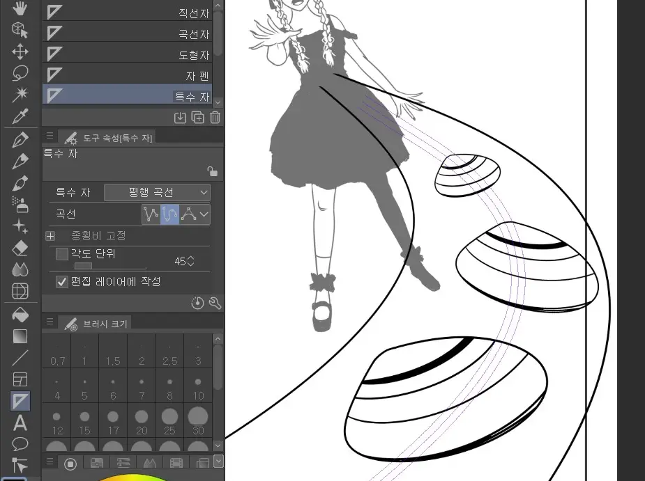 엔터 키를 입력하면 위처럼 곡선 자가 만들어진다. 해당 레이어 위에서 펜을 선택하고 선을 그리면 위 곡선 자의 각도와 모양을 따라 선이 그려진다.