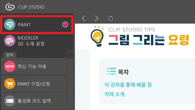 클립 스튜디오 PAINT 프로그램은 먼저 런처에 접속 후 화면 왼쪽 메뉴를 통해 실행해야 한다. 참고로 런처 화면에는 각종 공지사항이나 공모전, 그림 팁 같은 정보도 많아서 유용한 면은 있다.