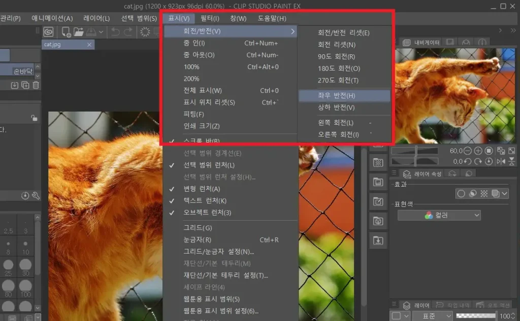 클립 스튜디오에 이미지를 불러왔다면 상단 메뉴의 표시(V) – 회전/반전(V) – 좌우 반전(H)를 하면 이미지의 좌우를 바꿀 수 있다.