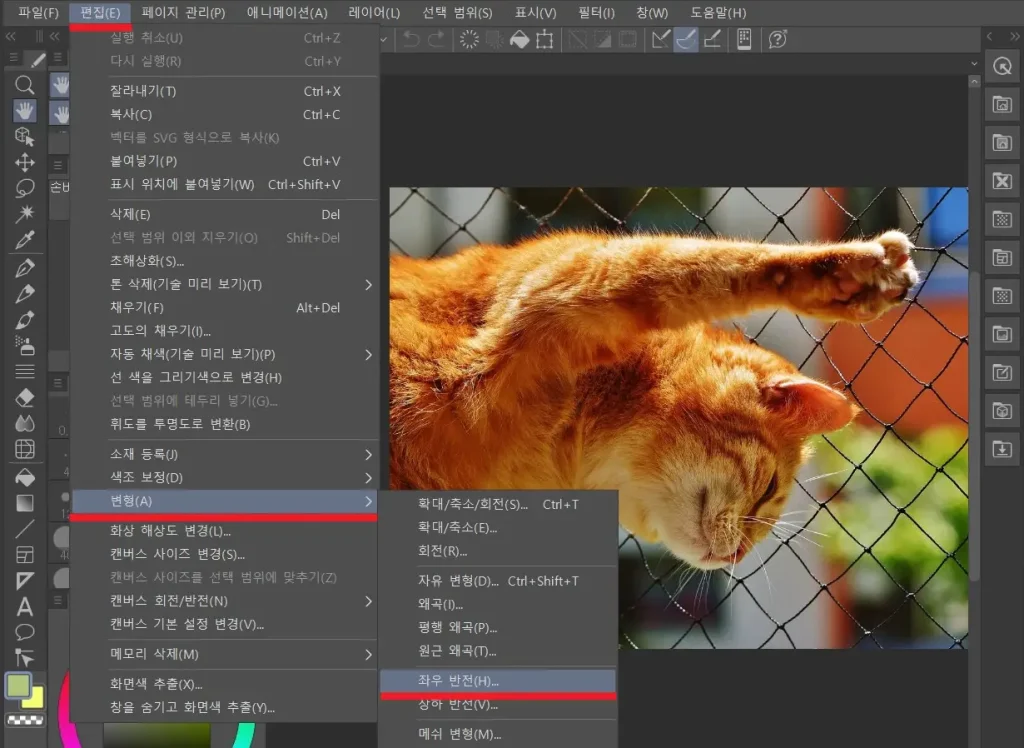 이미지에 제대로 반전을 적용하려면 상단 메뉴 중 편집(E) – 변형(A) – 좌우 반전(H)를 적용해야 한다.