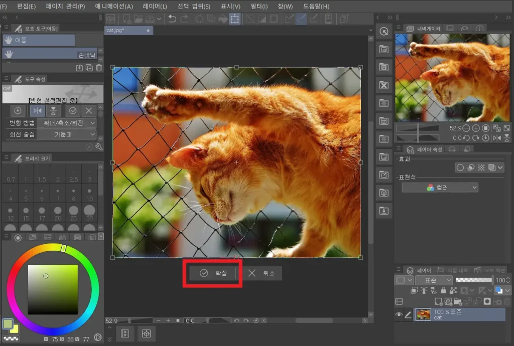 옵션 선택을 마치면 이미지 가장자리에 변형 표시가 생기는데 아래 [확정] 버튼을 눌러야 반전 효과가 적용된다. (네비게이터도 반전 이미지로 나온다) 이제 파일을 저장하면 반전이 적용된 상태 그대로 유지할 수 있다.