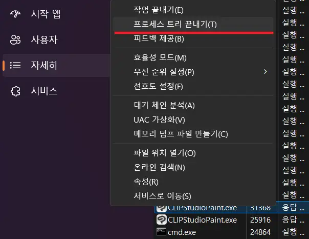 위 방법으로 안된다면 조금 전 우클릭 메뉴 창에서 세부 정보로 이동(G) 후 다시 아이콘을 찾아서 프로세스 트리 끝내기(T)를 시도해 보자.
