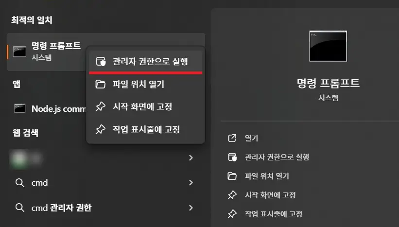 윈도우 작업 표시줄 검색 창에 cmd 입력 후 명령 프롬프트가 나오면 마우스 우클릭 – 관리자 권한으로 실행이 필요하다.