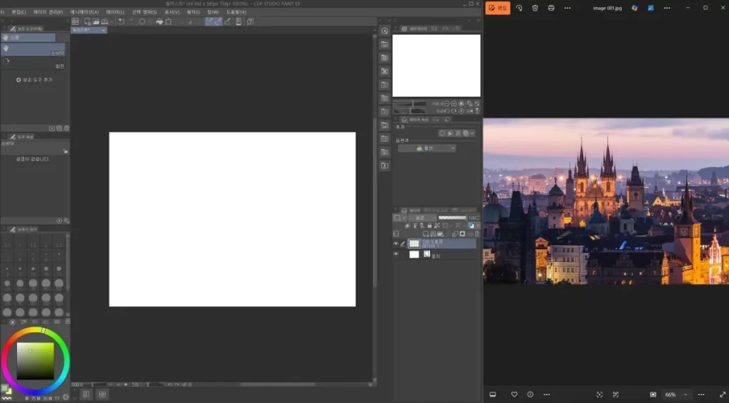 듀얼 모니터를 사용 중이라면 1번 모니터는 클립 스튜디오를, 2번 모니터에는 참고 그림을 띄우는 방식이 편할 것이다. 만약 싱글 모니터를 이용한다면 화면 자체를 분할하는 것도 좋은데 방법도 간단하다.