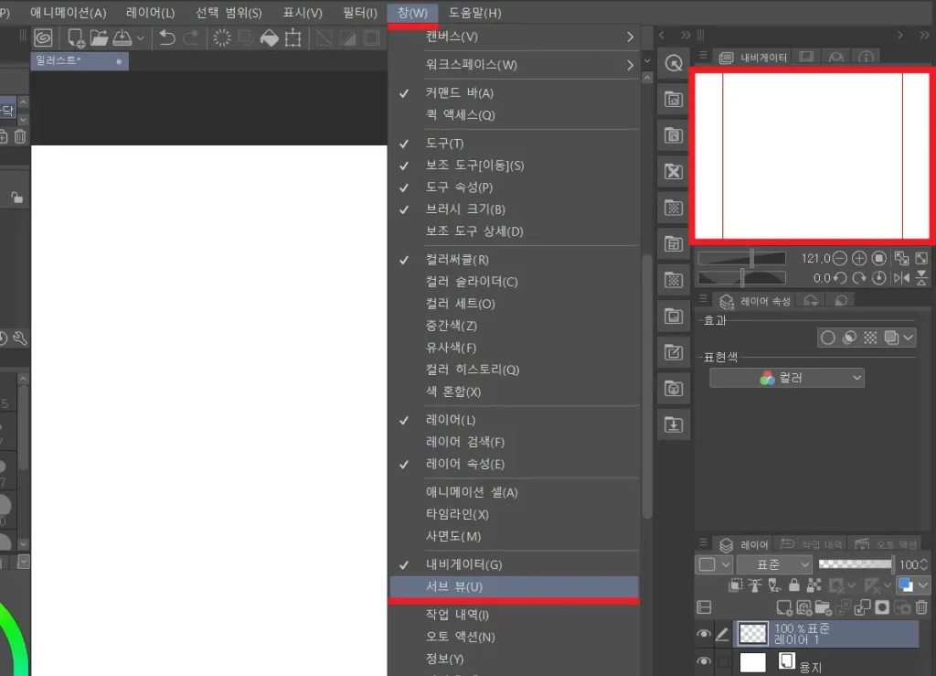 먼저 상단 메뉴의 창(W) – 서브 뷰(U)를 선택하자.