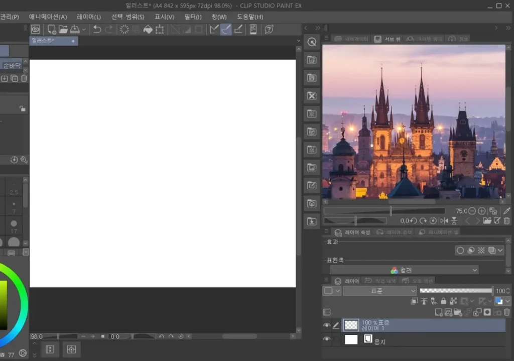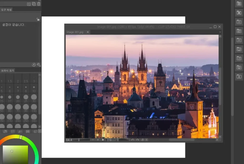 여기서 클립 스튜디오와 이미지 경계선에 마우스를 가져가면 ↔ 좌우 화살표가 나오는데 그대로 잡아서 비율을 조정하면 된다. 만약 이런 화면 분할이 번거롭다면 클립 스튜디오 안에서만 참고 이미지를 여는 것도 가능하다.