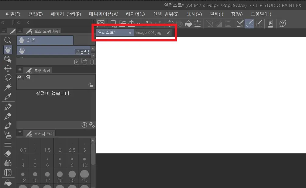 우선 상단 탭의 파일(F) – 열기(O)로 참고 그림을 불러오거나 그림을 직접 클립 스튜디오 화면으로 드래그&드롭하면 위처럼 탭 2개가 생길 것이다.