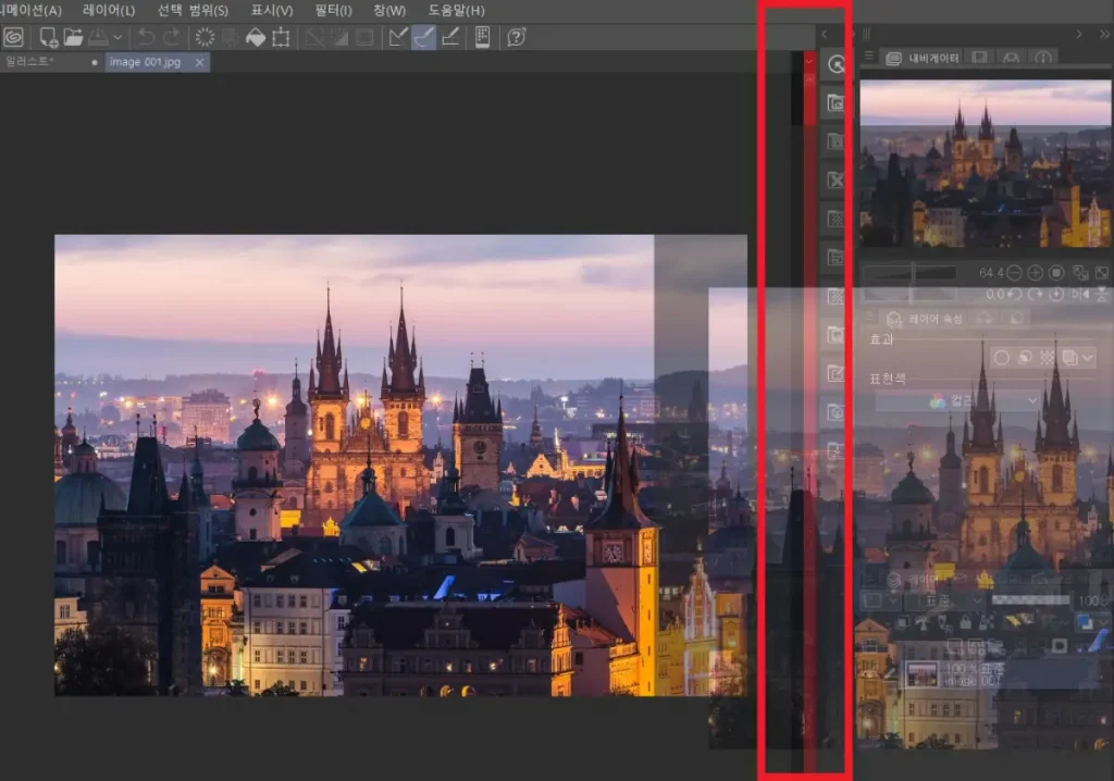 다음은 클립 스튜디오 화면 자체를 나누는 방법인데, 참고 이미지를 마우스로 잡은 상태로 작업 화면 영역 끝에 가져가면 위처럼 빨강/검정 막대가 나타난다.