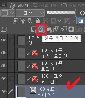 클립 스튜디오에서 벡터 레이어를 만드는 방법은 크게 두 가지가 있다. 먼저 화면 오른쪽 레이어 탭에서 정육면체 아이콘을 클릭하면 벡터 레이어가 만들어진다.