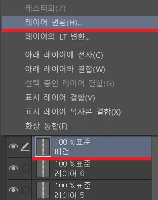 혹은 이미 만든 레스터 레이어에 마우스 우클릭 – 레이어 변환(H) – 벡터 레이어 선택 – [OK] 버튼을 클릭하면 기존 레이어를 벡터 레이어로 변경할 수 있다. (변경할 레이어 선택 후 화면 상단 메뉴 – 레이어 – 레이어 변환으로 가도 같음)