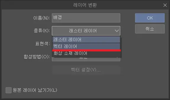 참고로 창 아래 옵션을 체크하면 원본 레이어는 그대로 두고 벡터 레이어가 추가로 만들어진다.