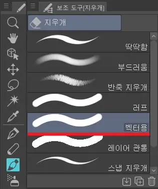 선이 겹친 곳을 지우려면 지우개(E)를 사용하면 되는데 ‘벡터용’이라고 되어 있는 전용 지우개를 선택해야 한다.