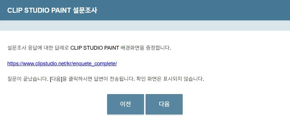 클립 스튜디오 버전 업을 구매했더니 설문조사 링크가 있어서 답변해 보았다. 질문은 10개 정도였고 주로 구매자가 어떤 경로로 클립 스튜디오를 구매했는지에 관한 내용이 많았다.