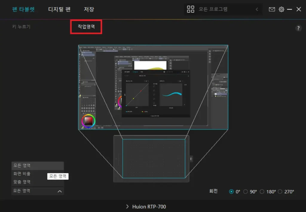 지금 사용 중인 Huion 드라이버의 작업 영역을 봐도 모니터 전체 영역에 설정되어 있는데 어딘가 이상했다.
