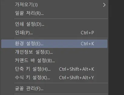 해결 방법은 간단했는데 먼저 클립 스튜디오 상단 메뉴에서 파일(F)을 클릭하고 환경 설정(E)을 선택하자. 아니면 Ctrl+K 단축키를 바로 입력해도 된다.