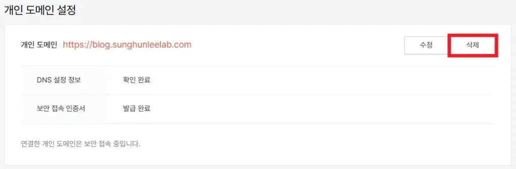 먼저 티스토리 로그인 – 대시보드 – 왼쪽 메뉴 관리 – 블로그로 온 다음, 도메인을 연결할 때와 반대로 [삭제] 버튼을 누르면 된다.